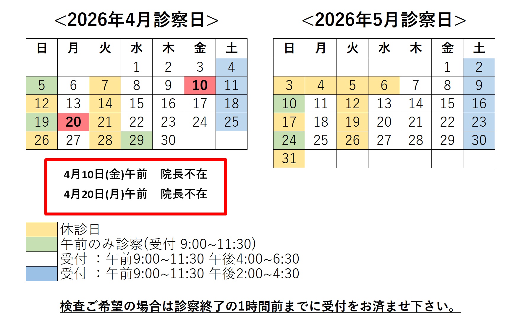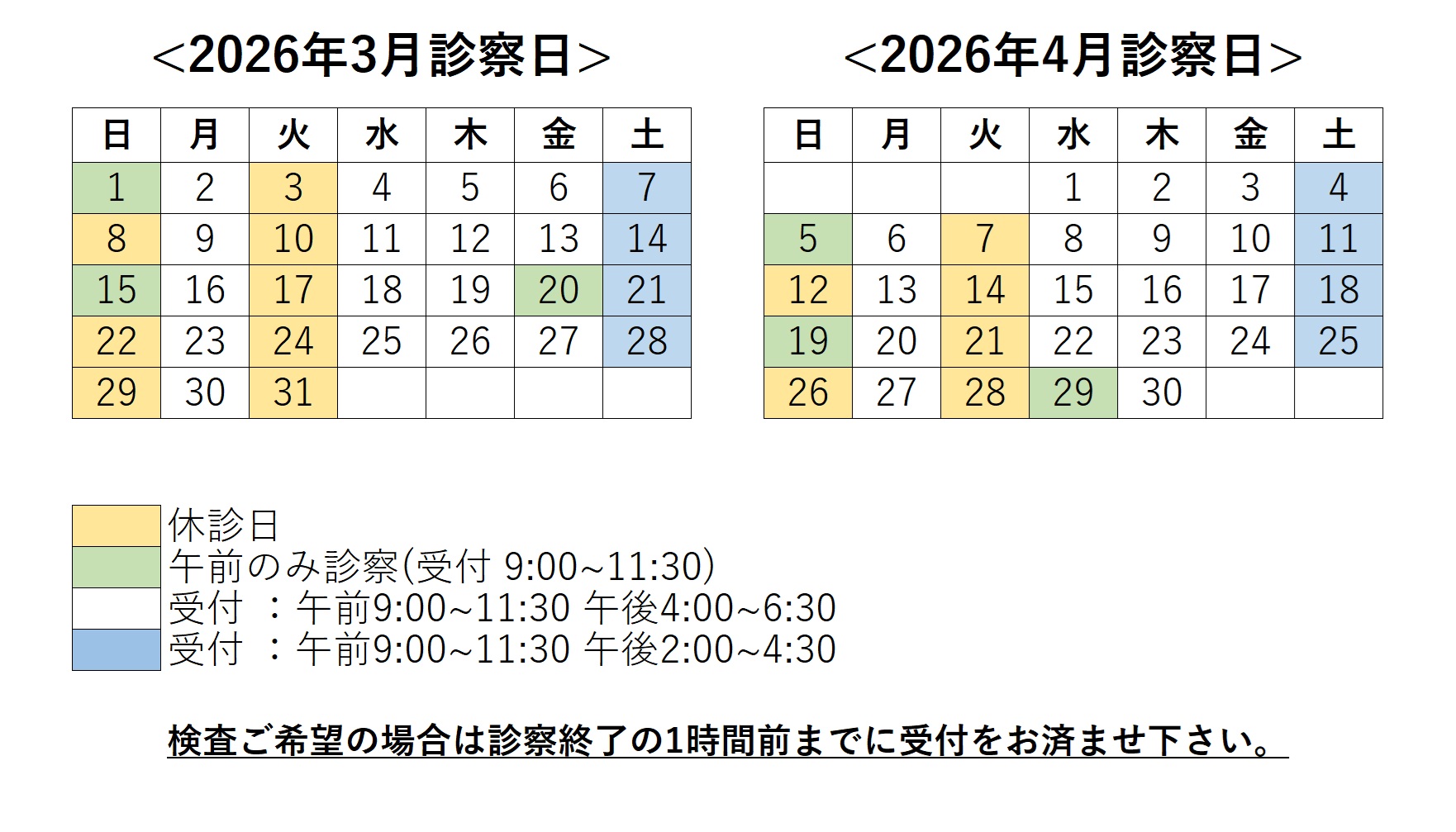 ・検査(血液検査など)をご希望の方はお早めにご来院いただき、受付の際にお申し出ください