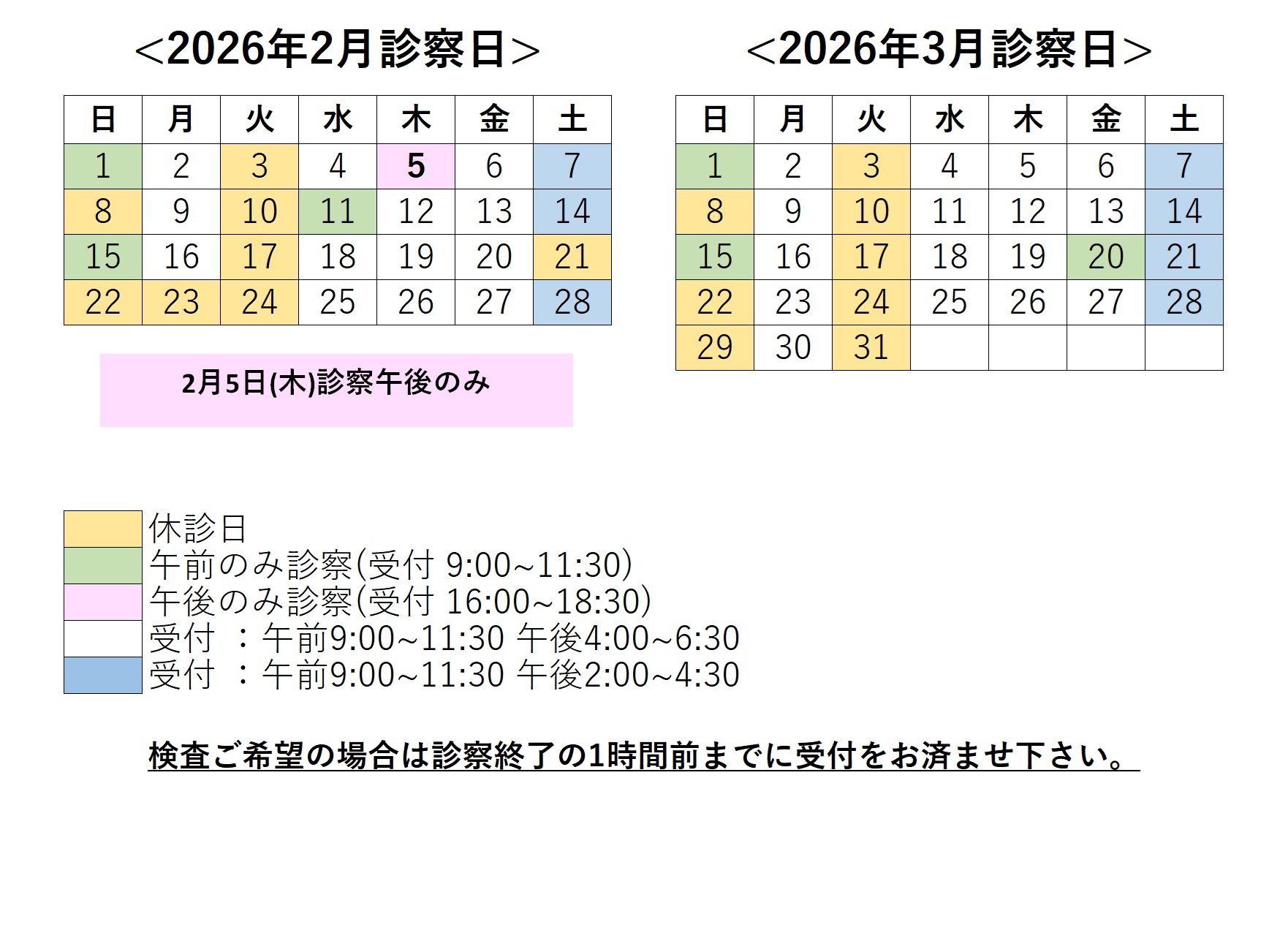 ・検査(血液検査など)をご希望の方はお早めにご来院いただき、受付の際にお申し出ください